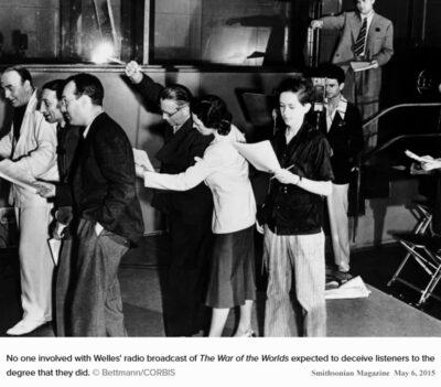 Because in the end, The War of the Worlds wasn’t about Martians. It was about us—our willingness to believe what was telegraphed through the growing expanse of radio, a medium that, up until that night in 1938, had emanated only responsible voices we trusted—and never thought to pause to ever question.