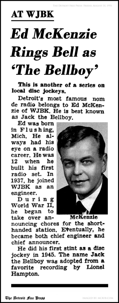 Inspired by Lionel Hampton’s recording “Jack the Bellboy,” McKenzie adopted the name for his new disc‑jockey persona. The Bellboy quickly became one of the most recognizable voices in the city, blending warmth, rhythm, and personality in a way that set WJBK apart.
