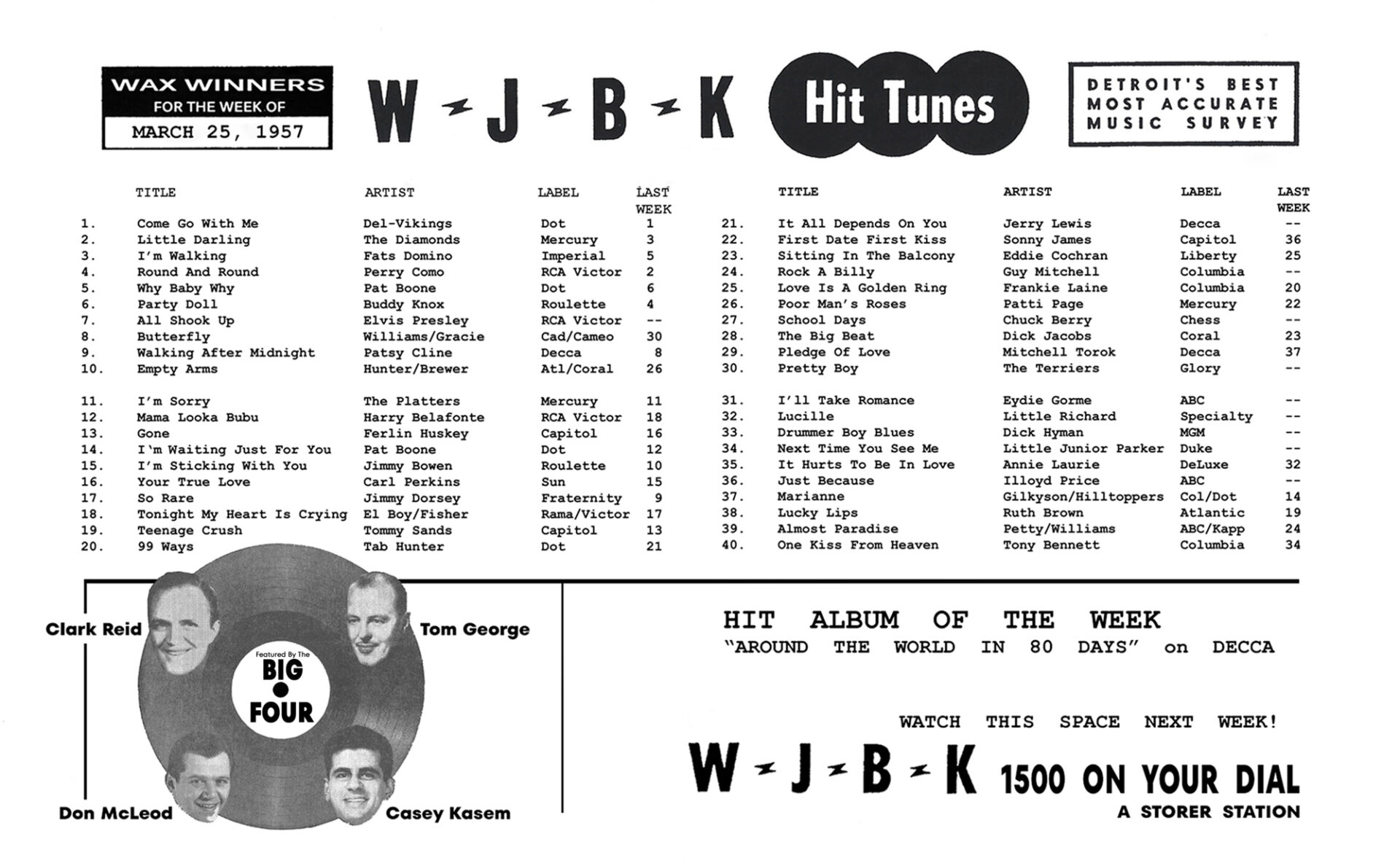 By April 1958, WJBK’s programming identity was fully crystallized in its Formula 45 Music Guide — a weekly survey listing the station’s top 45 singles. The April 21, 1958 survey featured: